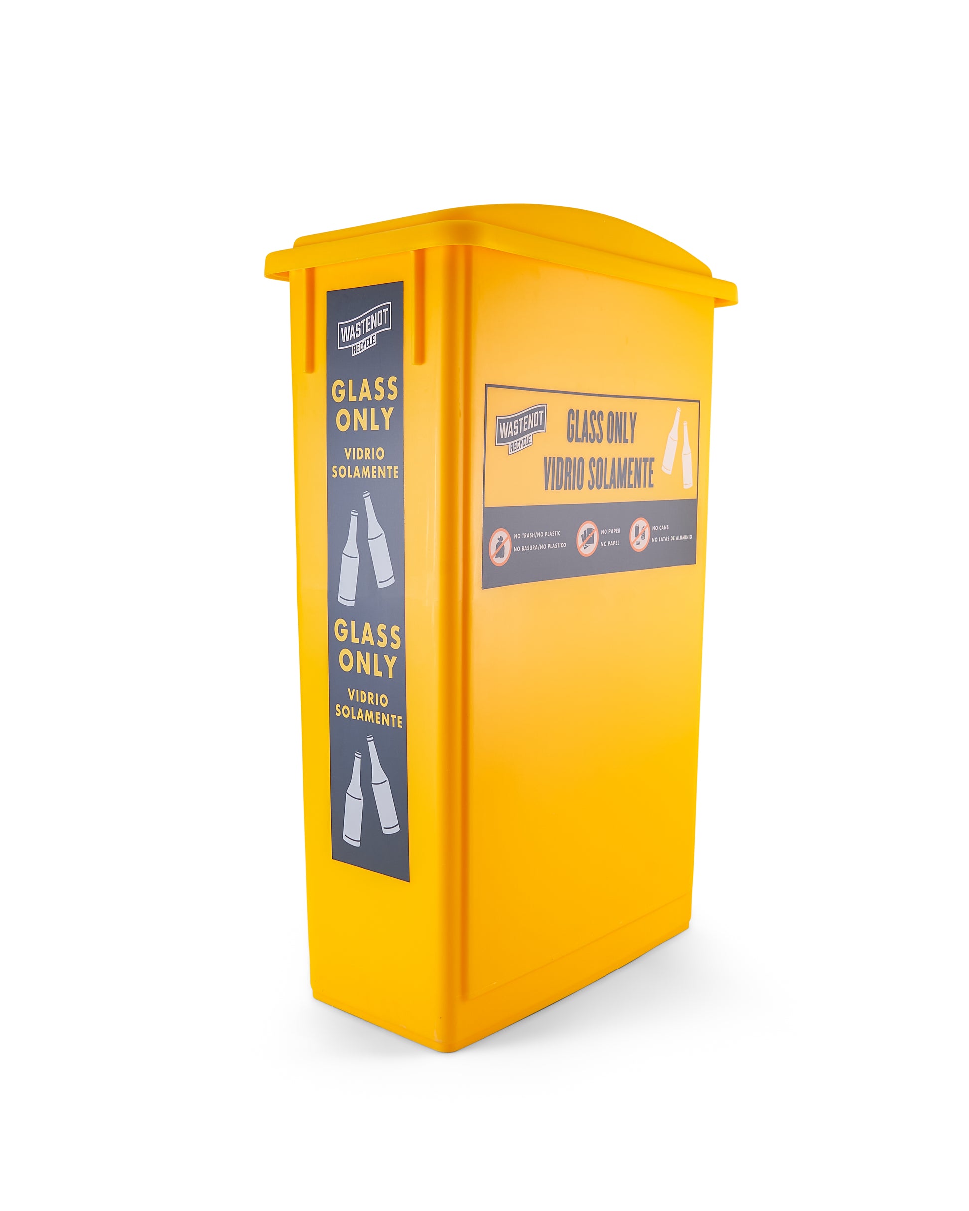 This 23 gallon "Slim Jim" bin is perfect for both back of house and front of house usage for no-hassle recycling of glass waste. The Slim Jim comes with the pictured signage for easy communication to employees and customers.